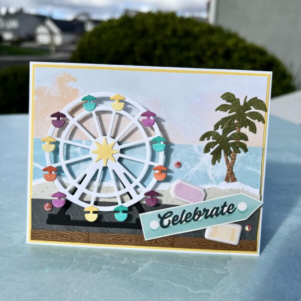 My colors are: Daffodil Delight, Summer Splash, Blackberry Bliss, Timid Tiger and Petunia Pop. Check out the video where I show how I cut the black base of the Ferris wheel, the coloring of the carts and trees.
