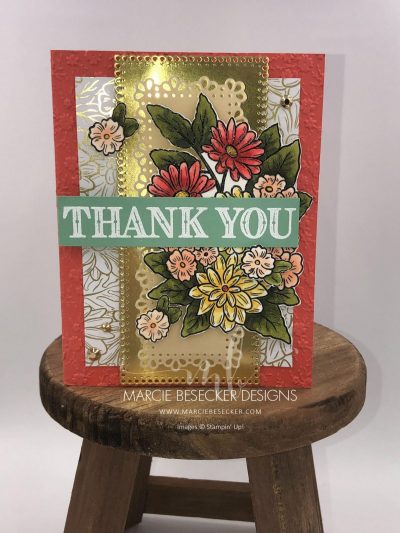 Three small flower and the large flower images were colored with Stampin’ Blends. I used Mossy Meadow, Old Olive, Calypso Coral, Poppy Parade, Petal Pink and Daffodil Delight. I went into more details on the video.