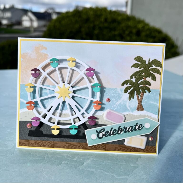 Oh what fun this card was to create.  What a fun card for anyone, but I especially see it for kids. Choose the colors of your choice for the Ferris wheel carts.  I chose from the DSP colors. My colors are:  Daffodil Delight, Summer Splash, Blackberry Bliss, Timid Tiger and Petunia Pop.  Check out the…