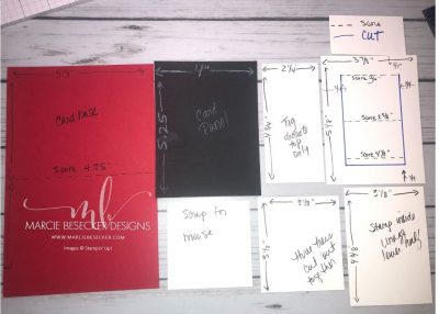 Pop Up Panel 3 7/8″ x 5 1/8″ – Cut 3 sides of a rectangle 3/4″ from the sides and bottom. Do NOT cut the top. Score just the cut piece at 3/4″ (top), 2 5/8″ (middle) and 4 1/8″ (bottom).